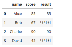 df['result'] = df['score'].where(df['score'] >= 70, other='재시험')