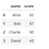 'score': [85, 67, 90, 45]