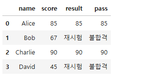 → 조건을 만족하는 곳은 원래 값 유지, 아니면 '재시험'으로 치환