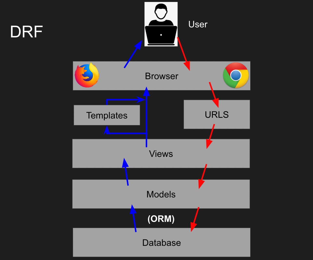 Django์ ๋ค๋ฅด๊ฒ ํ๋ก ํธ์๋๋ฅผ ๊ฐ๋ฐํ์ง ์๊ธฐ ๋๋ฌธ์ Model๊ณผ View ๊ทธ๋ฆฌ๊ณ Serializer๊ฐ ๋ฉ๋๋ค. DRF์ ๊ตฌ์กฐ์ ๋ํด์ ์ง์นญํ๋ ํจํด์ ์์ต๋๋ค. ๋ฐฑ์๋์ ์ฉ๋๋ก ์ฌ์ฉํ๊ธฐ ๋๋ฌธ์ Template์ ์ฌ์ฉํ์ง ์์ต๋๋ค. ๋์ , JSONํ์ผ์ ํ์์ผ๋ก ํ๋ก ํธ์๋์ ๋ฐ์ดํฐ๋ฅผ ์ฃผ๊ณ ๋ฐ์ต๋๋ค.