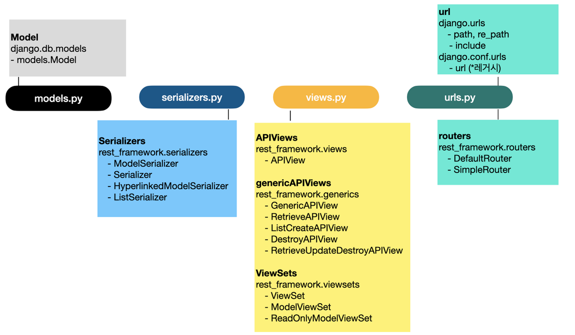 - ์๋ ๊ทธ๋ฆผ์ DRF์์ ์ฌ์ฉํ๋ ๋ชจ๋์ ๋์ดํ ๊ฒ์ ๋๋ค.