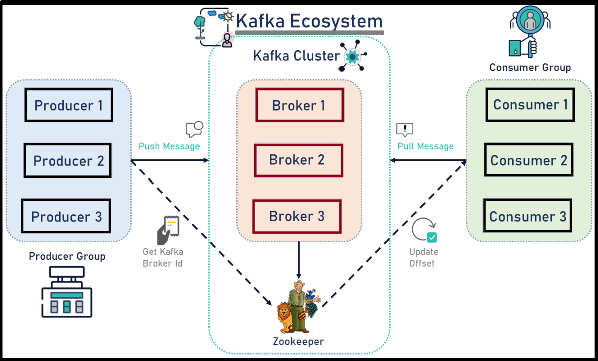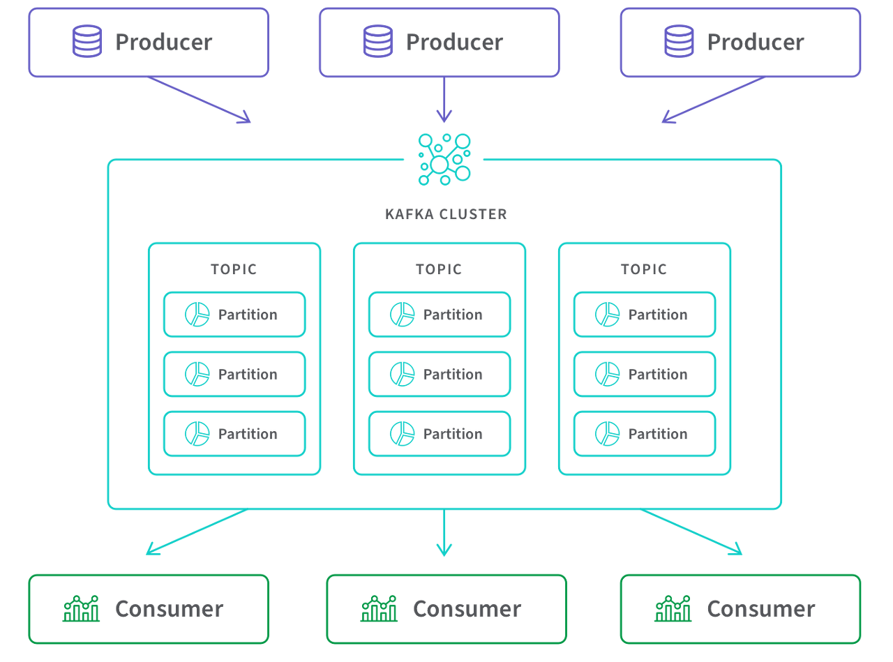 - KafkaCluster : 카프카의 브로커들의 모임. Kafka는 확장성과 고가용성을 위하여 broker들이 클러스터로 구성