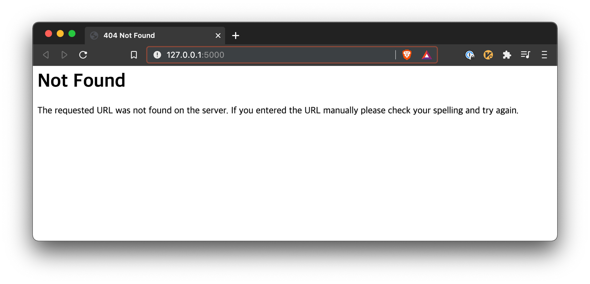 웹 브라우저를 키고 접속해 보면 애플리케이션에 접근할 수 있지만 아무 설정도 없기 때문에 404 (Not Found) 페이지가 보이게 될 겁니다.