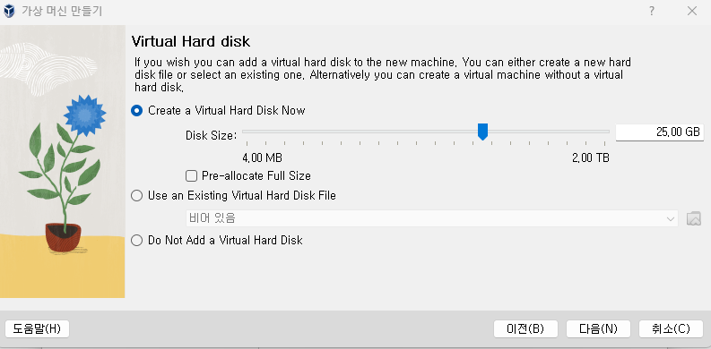 이제 Hard disk 용량 설정 화면인데 이것도 위에 메모리처럼 알맞게 설정해주시면 됩니다.