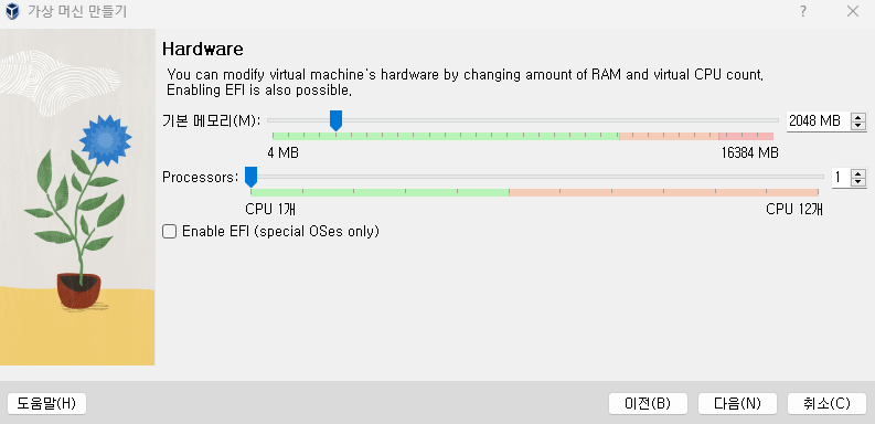 그 다음 화면은 컴퓨터 메모리 사양을 얼마나 지정할지에 대한 정보인데