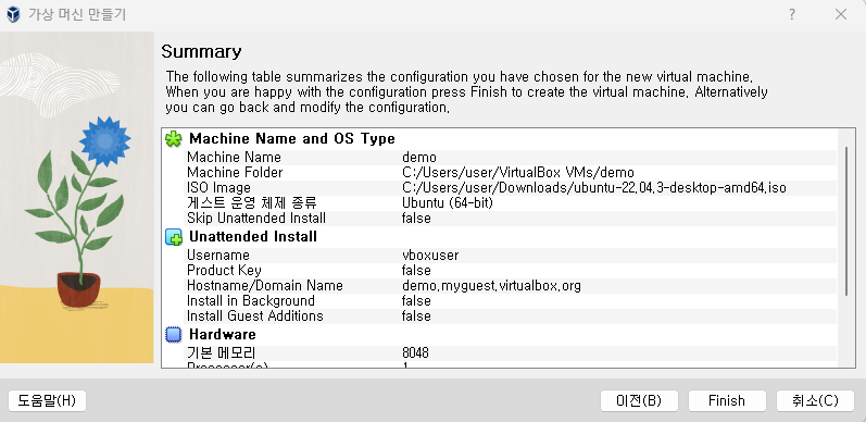 마지막으로 Summary 화면이 나오는데 내가 설정한 값이 맞는지 확인하고 최종적으로 Finsh를 눌러주시면 됩니다.