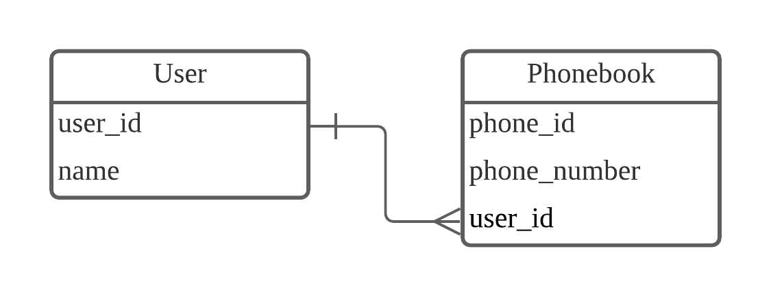 한 개의 전화번호당 한 명의 유저를 가지고 그 반대도 동일하다면 이것은 1:1 관계 (One-to-one relationship) 이라고 볼 수 있습니다.