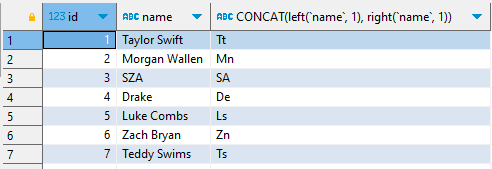 CONCAT(LEFT(`name`, 1), RIGHT(`name`, 1))