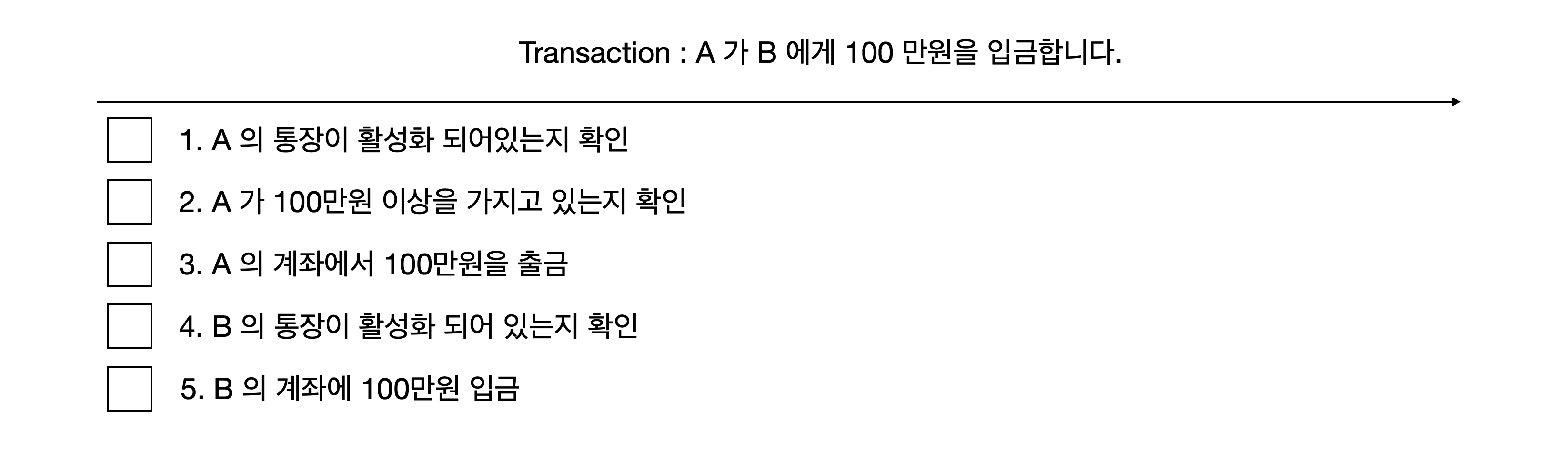 - 각 Transaction은 하나의 특정 작업으로 시작을 해 묶여 있는 모든 작업들을 다 완료해야 끝이 난다.